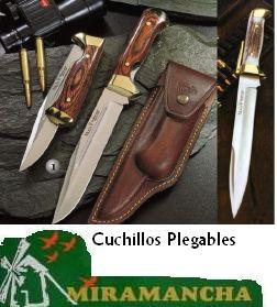 Descripcion: Cuchillos caza plegables, con funda, puño madera y cuerna. |